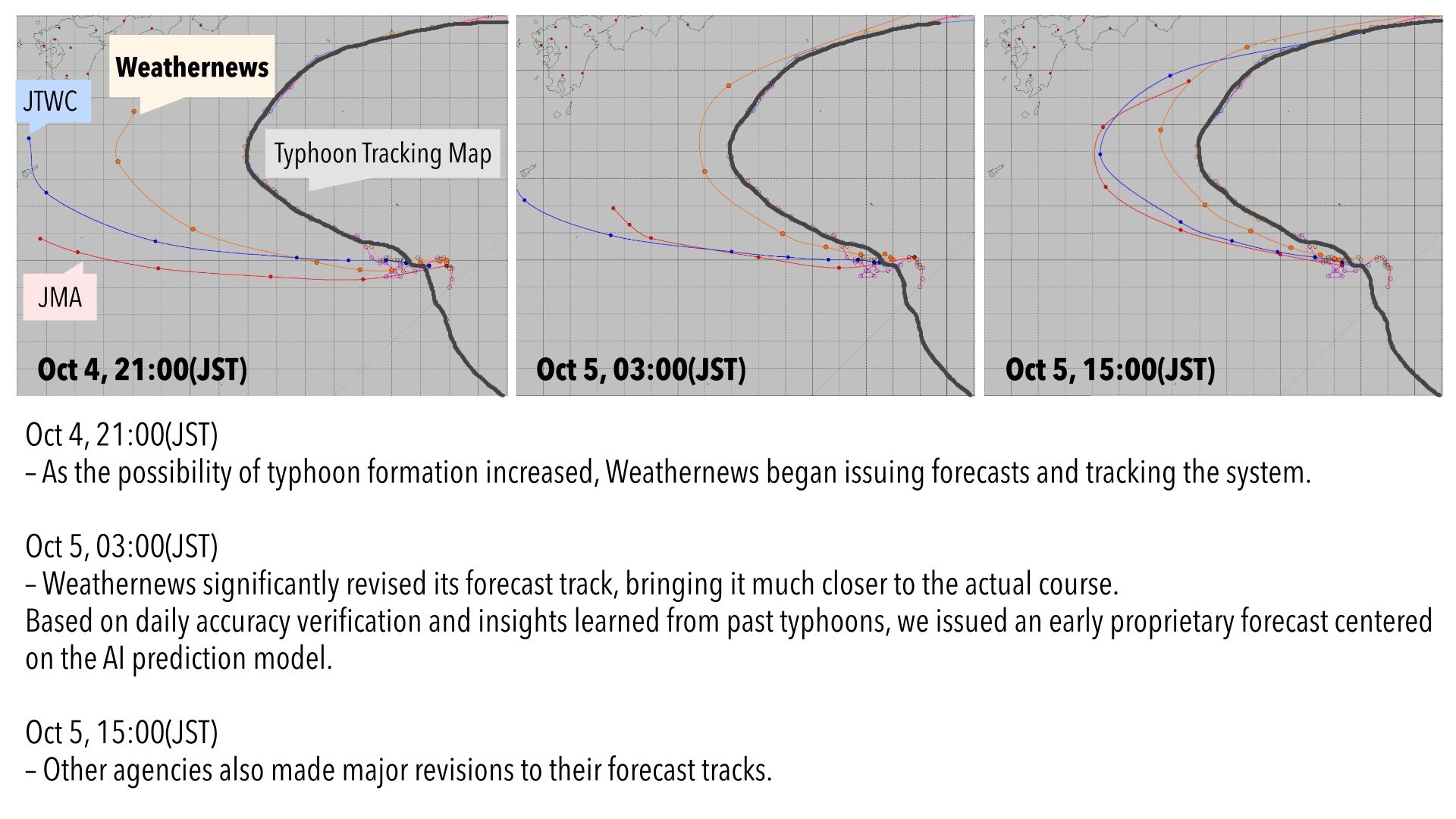 Note: Figure 2 compares track predictions for Typhoon No. 22 from various forecasting agencies. By leveraging the Global Storm Center's expertise and incorporating AI model results, the Weathernews forecast (orange line) delivered a more accurate track prediction earlier than other agencies.