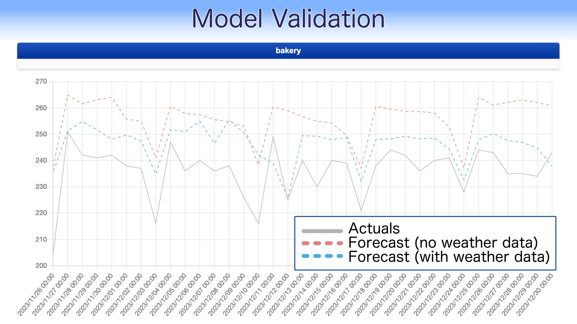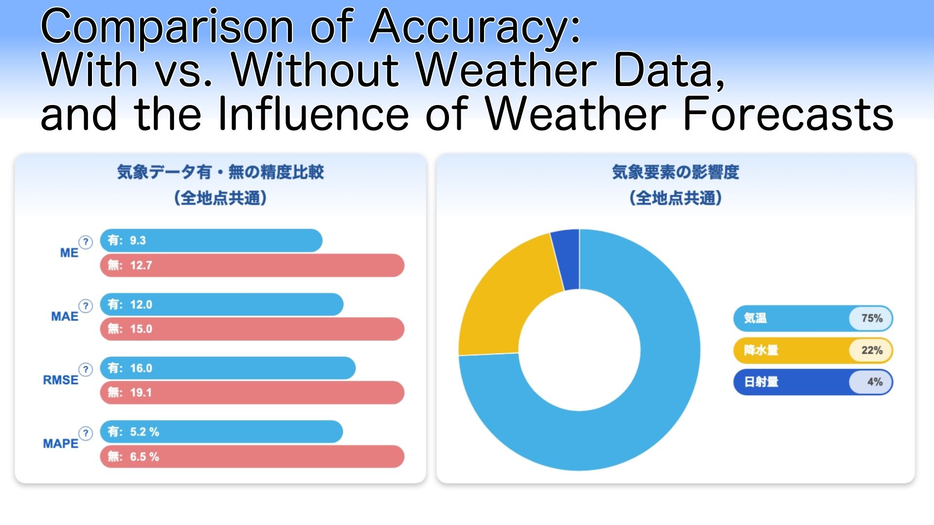 Model B (Weather-Integrated): Takes everything from Model A and adds Weathernews' high-resolution weather data to create a more sophisticated forecast.