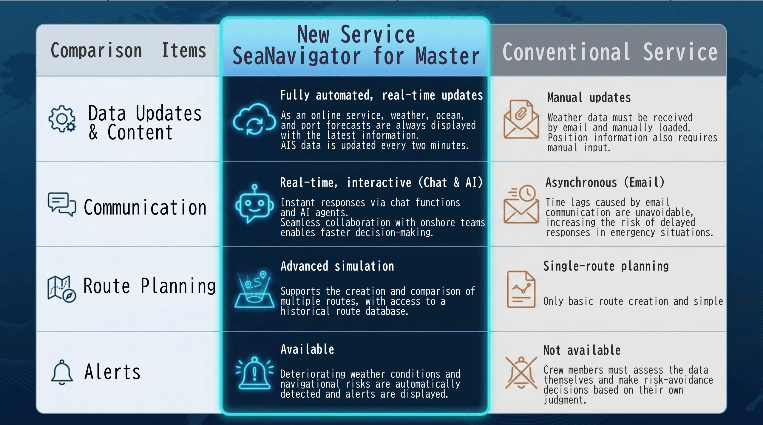 Today, SeaNavigator for Master is already being used across 20 companies worldwide. Captains are telling us things like "Accessing real-time information has become so much easier" and "It was a lifesaver during Typhoon No. 18." This feedback confirms that having current, reliable data at sea makes a real difference.