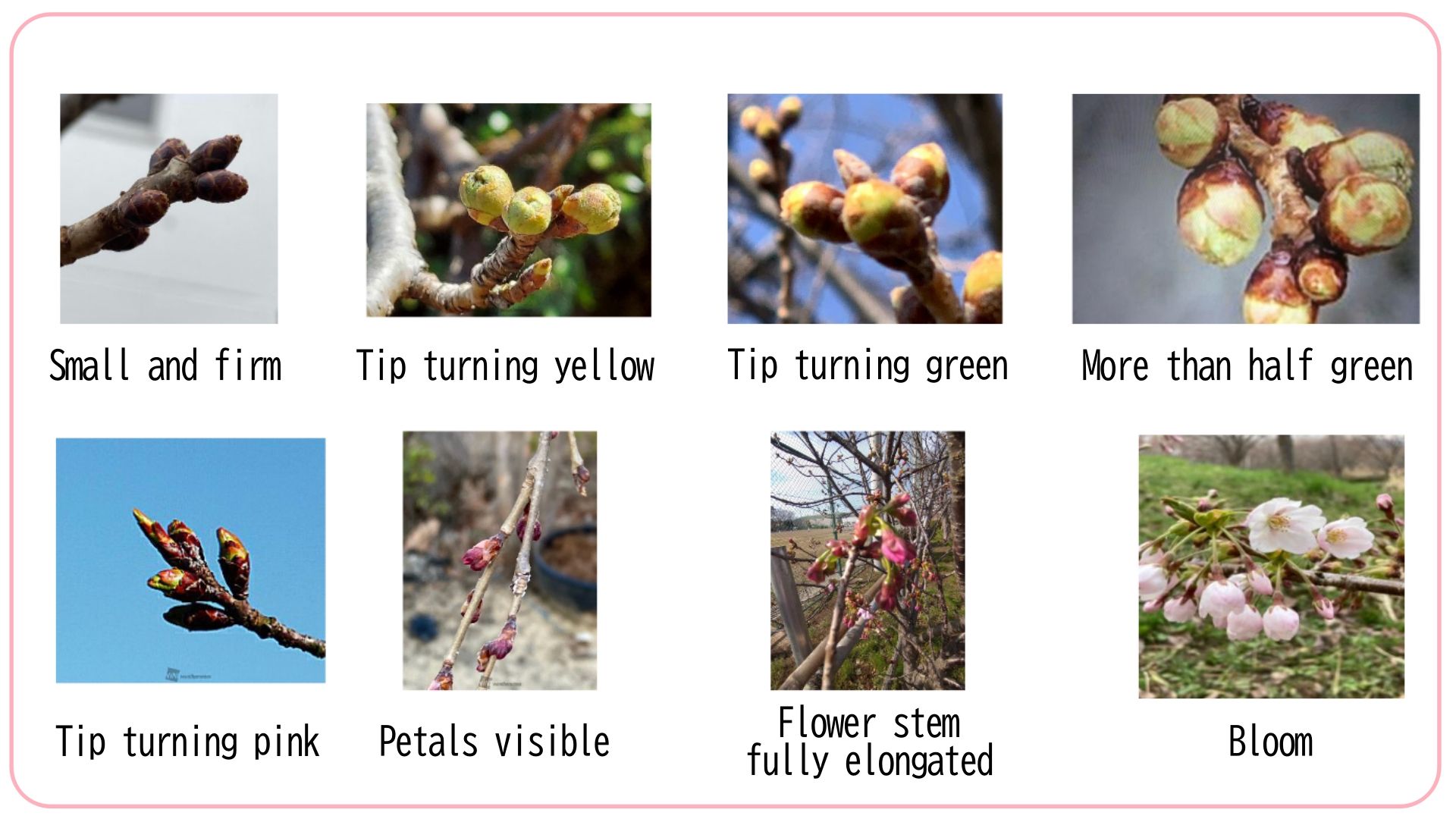 When you submit a photo of a cherry blossom bud, the AI analyzes and classifies its growth stage into one of seven distinct levels:
