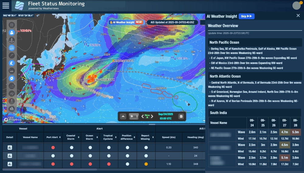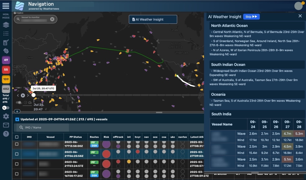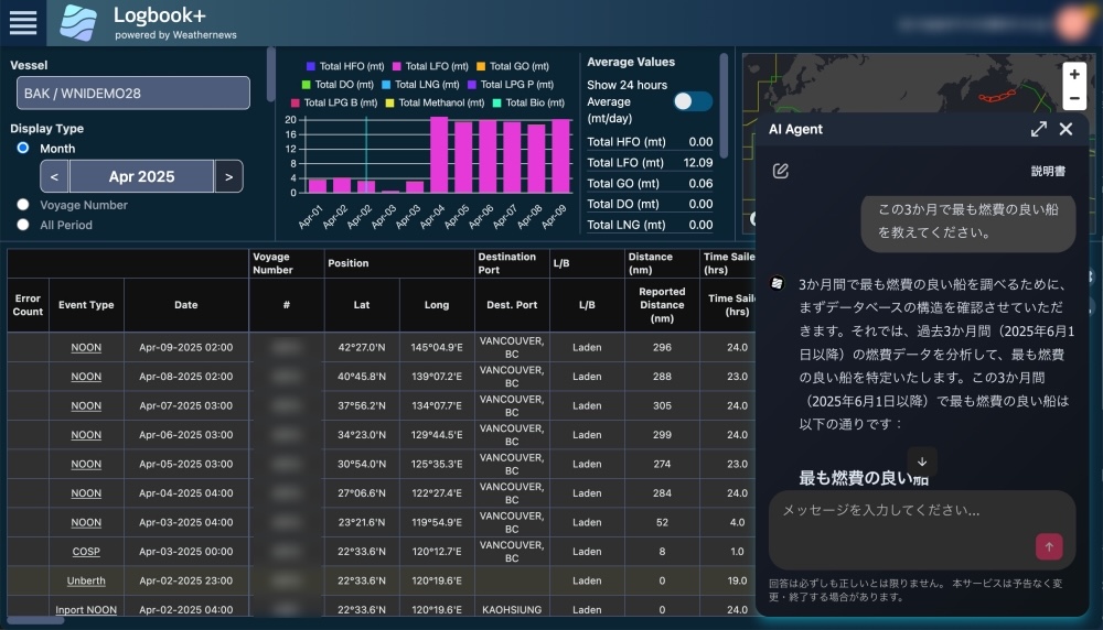 Weathernews Inc. (Headquarters: Chiba, Japan; President and Representative Director: Tomohiro Ishibashi) has equipped SeaNavigator, its integrated marine weather service that takes into account environmental performance, safety, and economic efficiency to support vessel operations, with an AI engine and has commenced offering AI Weather Insight, which automatically generates weather and marine insights and automatically identifies vessels affected by inclement weather, and AI Agent, which helps optimize operations through analysis of vast marine and voyage data.