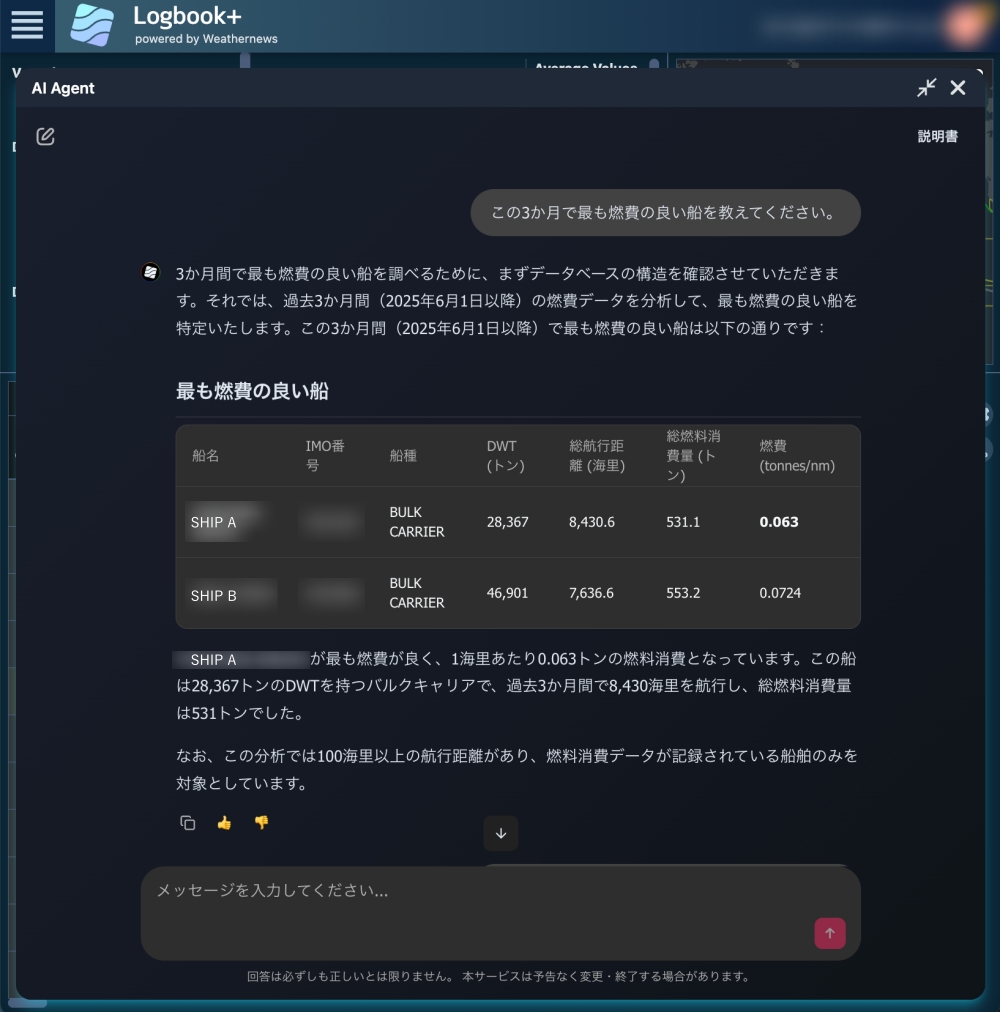 AI Agent allows users to obtain information on vessel performance in chat format based on vast voyage data from vessels under contract, something that previously required time-consuming manual analysis. In addition to performance data for vessels under contract, it can also a basic voyage information (such as IMO number and vessel specifications), voyage history, and vessel position data. This lets users obtain analysis results in text, graphs, and charts simply by asking questions in chat format, such as "Rank my vessels by those with the best fuel efficiency and fastest speed over the past three months" or, "Tell me which vessel has the best fuel efficiency when wave height exceeds four meters." This eliminates the need to manually set complex filters or navigate back and forth between multiple screens as was previously necessary, greatly improving the time and quality of analysis.