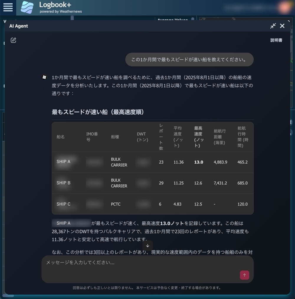 AI Weather Insight uses AI to automatically generate weather and marine insights in text and table format oceans throughout the world up to five days in advance and also identifies vessels affected by inclement weather based on vessel position and route information by instantly calculating wave and wind forecasts as well as the duration of the impact. This lets users check real-time forecasts even during inclement weather, allowing for safer route selection and greater understanding of delay risks. AI Agent allows users to simply ask a question in text format, which then accesses and analyzes past marine data, customer vessel position data, vessel performance, and other data and responds in chat format (conversational format). For example, a question such as "Which vessels have had good fuel efficiency and speed over the past three months?", which would normally take time to analyze manually, can be analyzed instantly using AI, achieving faster operational analysis of vessel performance.